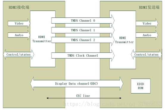 TMDS 也被称为过渡调制差分信号,它是一种微分信号机制,采用的是差分传动方式。HDMI 用 TMDS 技术编码时把视频信号分为 R、G、B 三种数据信号和行场控制信号 H、V。这五种信号分四个通道传输,R、G、B 分别占用通道0、通道1、通道2,行场控制信号在 C 信号通道里面传输,音频信号在 R、G 信号通道里面传输。另外还有独立的一个通道用来传输时钟数据。一个时钟周期一个 TMDS 通道可以传送 10bit 的数据。TMDS算法就是将原始的8位视频信号转换为10位数据来传输,原视频信号进过运算后转换为TMDS信号的前8位,TMDS的第9位用来指示运算方式,第10位则作为直流平衡,主要为了保证信道在编码过程中直流偏移为零。HDMI的系统框图: