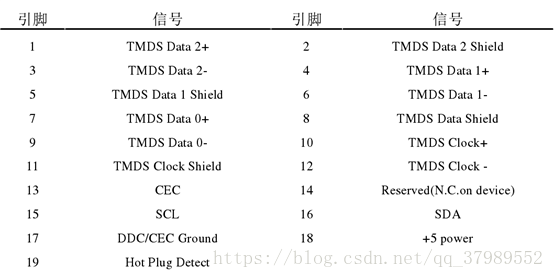 HDMI 接口根据外观和引脚数目不同分为三种型号:A 型、B 型和 C 型。A 型接口有 19 个引脚,是目前最常用的接口类型;B 型接口提供四组 TMDS 传输通道,因此尺寸稍大,有 29 个引脚,可以支持更高的数据传输率和传输超高清视频。而 C 型接口比 A 型接口体积小很多,但是功能一致,适合小型便携设备使用。一般使用的都是A型,A型的引脚图如图所示: