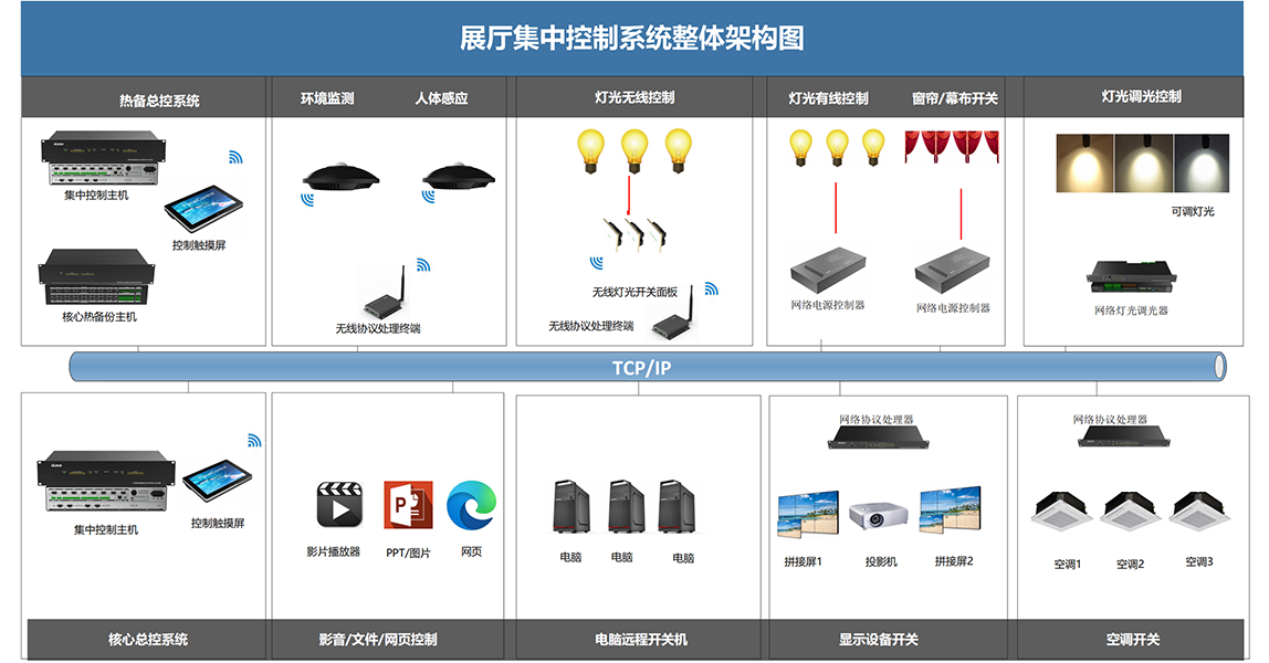展厅控制系统是ULEGS优格专门开发多种IOS ,安卓,WIndwos,液晶触摸屏等操作系统平合的多媒体中央控制系统。可实现对整个展馆的受控电子设备、投影机、工控主机、IED大屏幕、舞台灯光、液晶拼接、DP背投、沙盘、灯光、电视互动视频等(声、视、光、电)进行智能化集中控制,并对周边环境设备如窗帘、电动屏幕、电动门等进行智能化操控。支持集中控制、分展区独立控制、分展项独立控制、环境控制等多种系统集成方式,彼此互不干又互相关联一键开馆/闭馆100%将各个展区的灯光和设备全部开启/关闭;电脑主机开关机互锁功能,软关机功能,确保电脑主机系统正常开关机;支持影片播放、暂停、停止决进、快退、50个视频切换、音量大小、静音等几乎播放所有功能的控制;:可对影片播放的进度进行自制同时支持对展馆灯光可实现强度有强到弱等不同变化,亦可以实现任何的灯光场景模式,灯光会根据不同的情景,做出相应的调整。另外可以联动音乐、温度、湿度等设备进行相应的调整,通过光线感应来自动调整窗布的开合,以调整室内光线强度,各子系统同时接受中央控制系统的PAD控制亦或手动控制或联动控制。